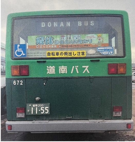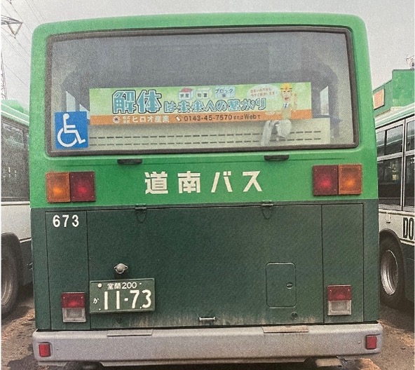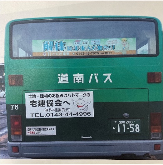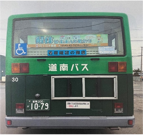 道南バス様の後方の窓に、ヒロオ産業の広告がついているバスがあります。 ぜひ探してみてください。